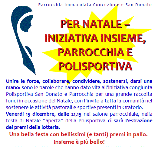 Venerdì 15 dicembre, dalle 21,15 nel salone parrocchiale, nella festa di Natale “aperta” della Polisportiva ci sarà l’estrazione dei premi della lotteria.