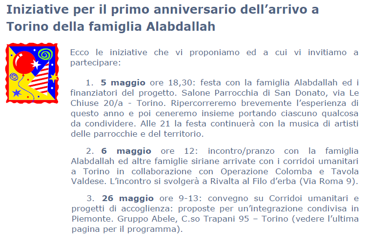 - un convegno il 26 maggio (dalle 9 alle 13 al Gruppo Abele, in corso Trapani 95) sui corridoi umanitari.